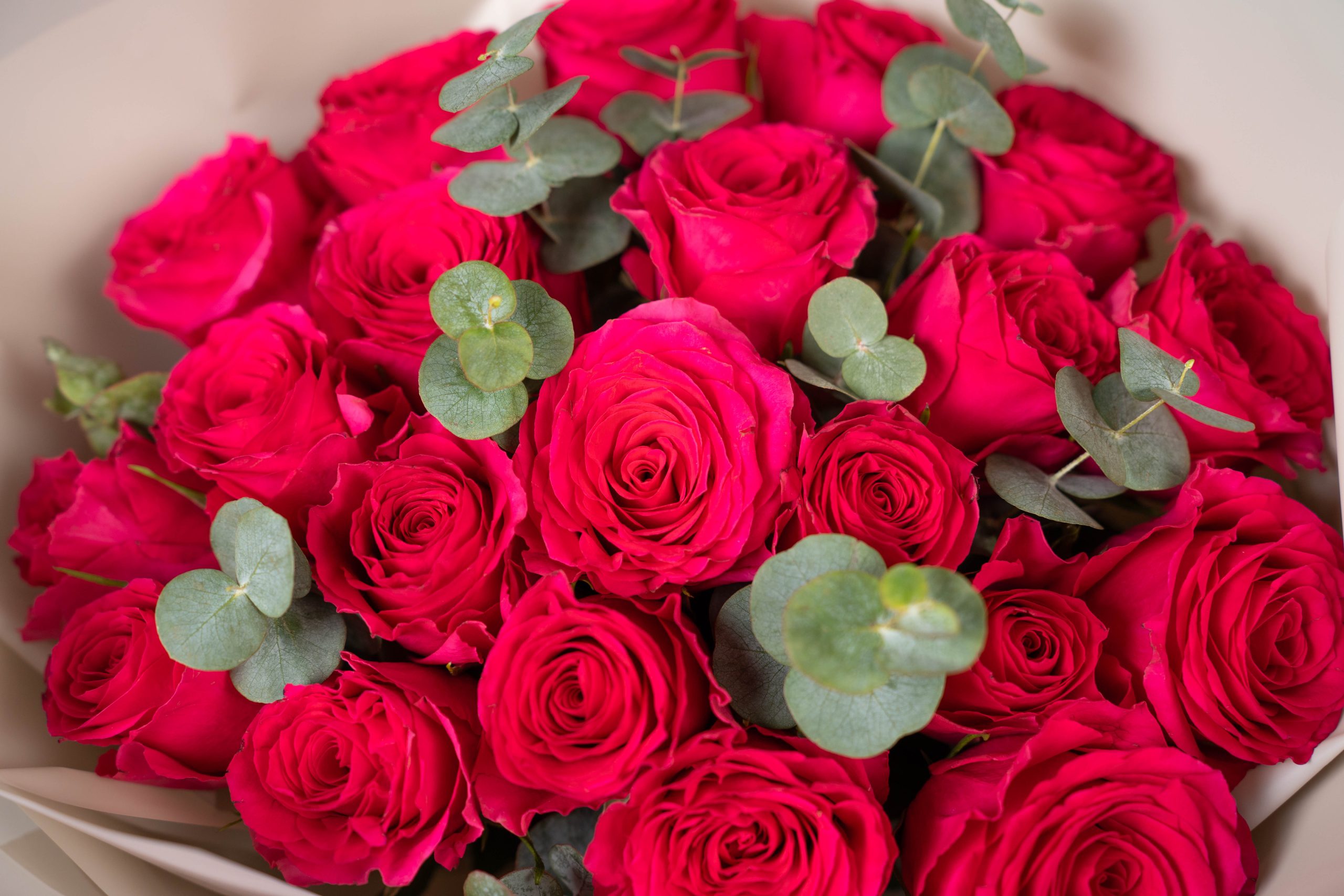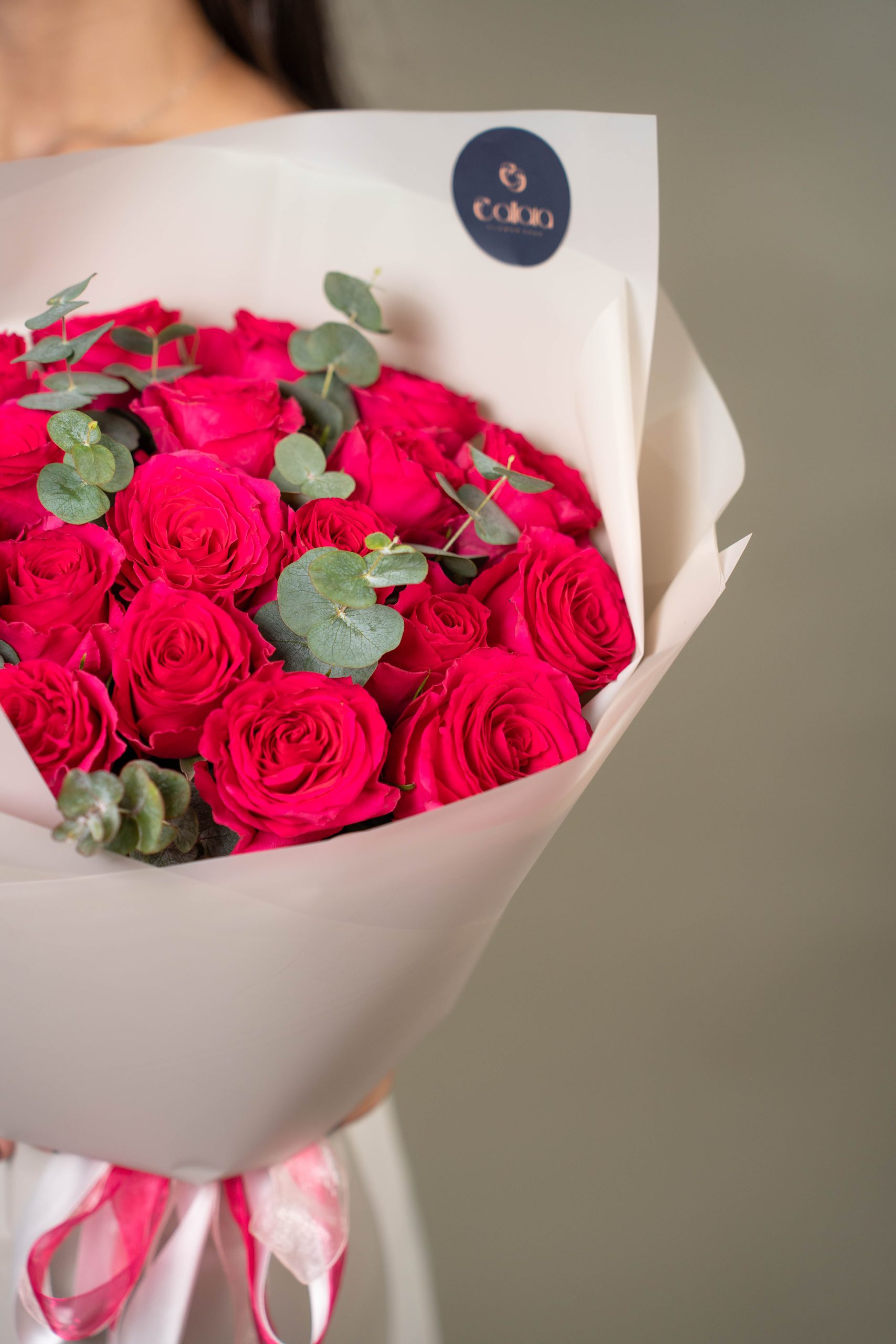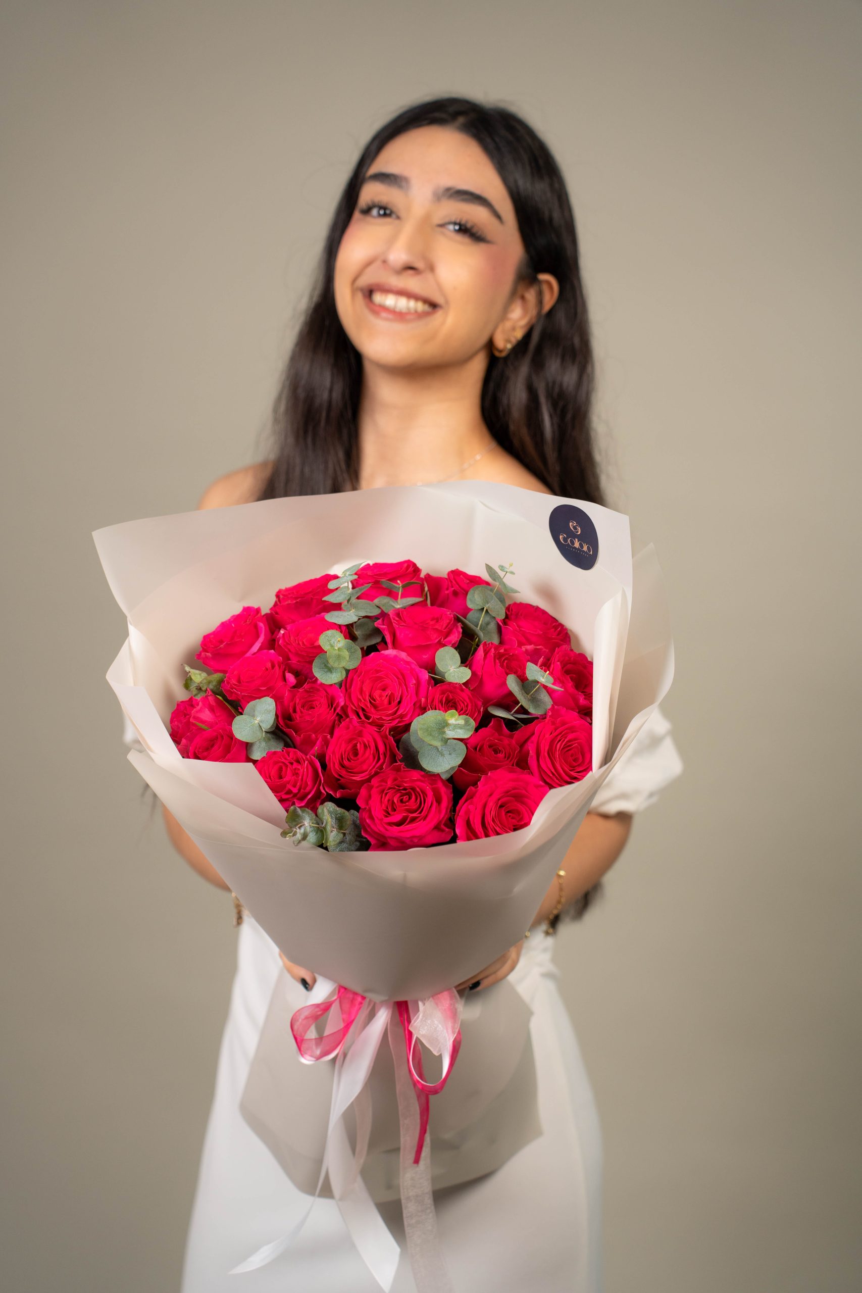 Eucalyptus leaves are placed throughout the bouquet, adding a natural green touch that balances the bright pink roses and gives the arrangement a fresh and lively feel. Wrapped in white paper and finished with a soft ribbon, Rose Pink Floyd’s Blooms has a clean and modern presentation that highlights the beauty of the flowers.