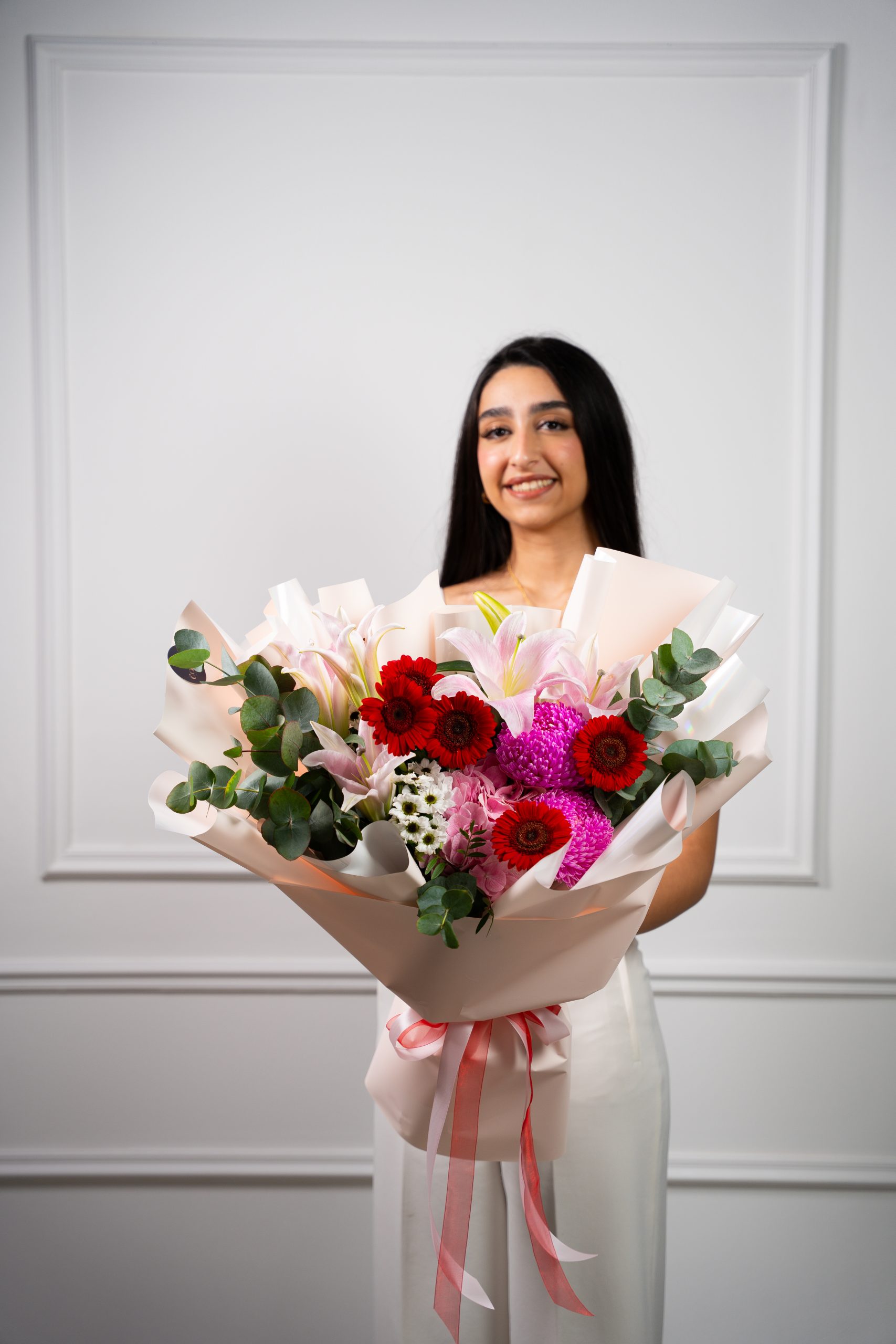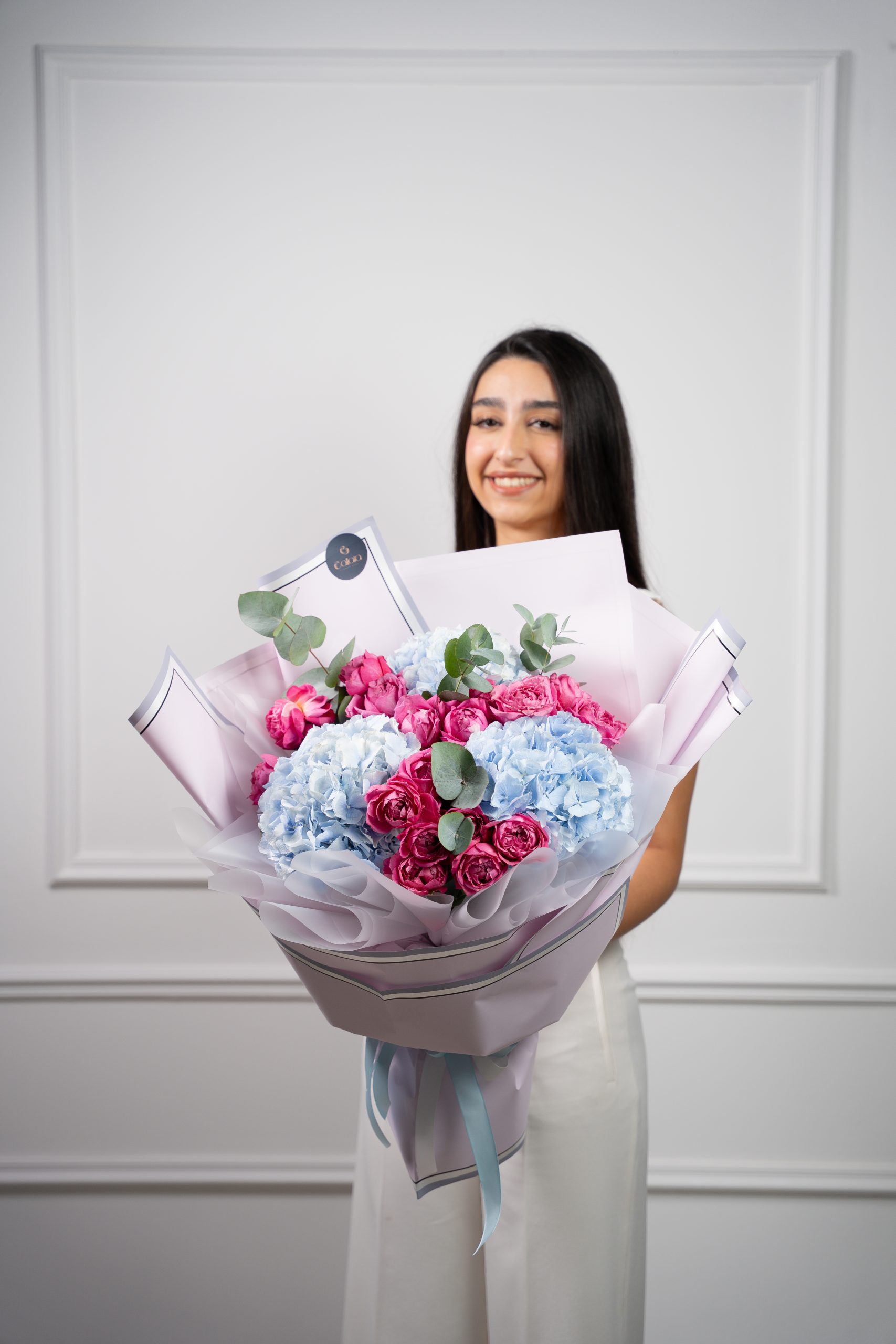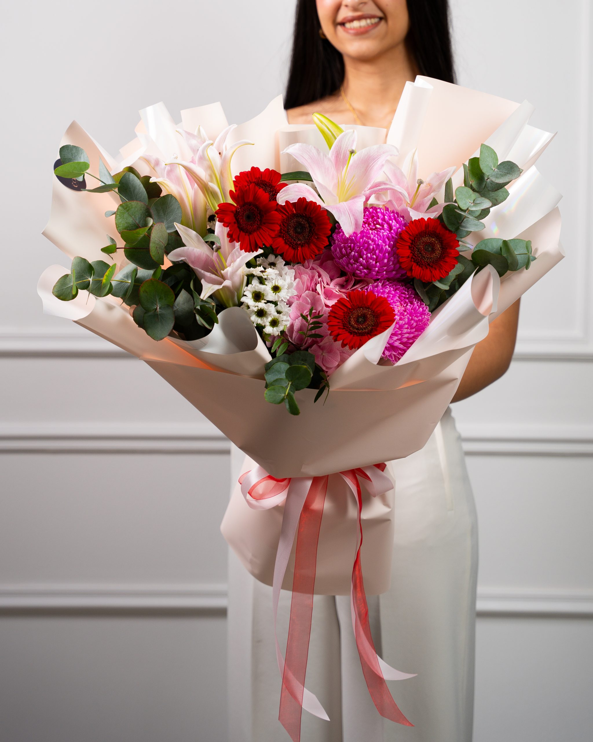 Rosehold is a romantic blend of deep and soft tones, crafted to leave a lasting impression. This elegant bouquet features deep purple roses, raspberry spray roses, pink alstroemeria, and peony-style chrysanthemums, paired with lush hydrangea and eucalyptus for freshness and charm. Wrapped in chic black paper with a satin ribbon, Rosehold is perfect for both grand gestures and thoughtful surprises.