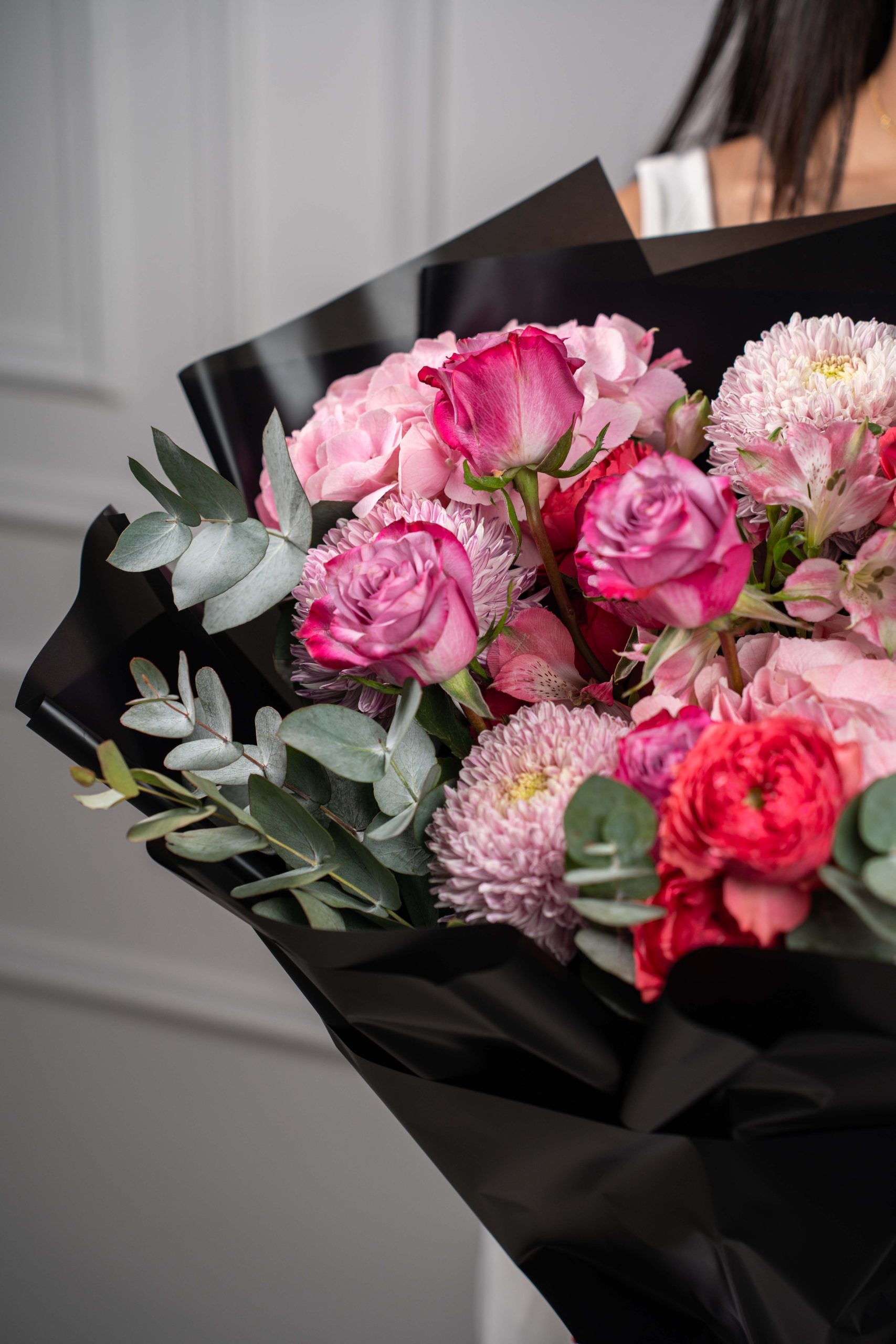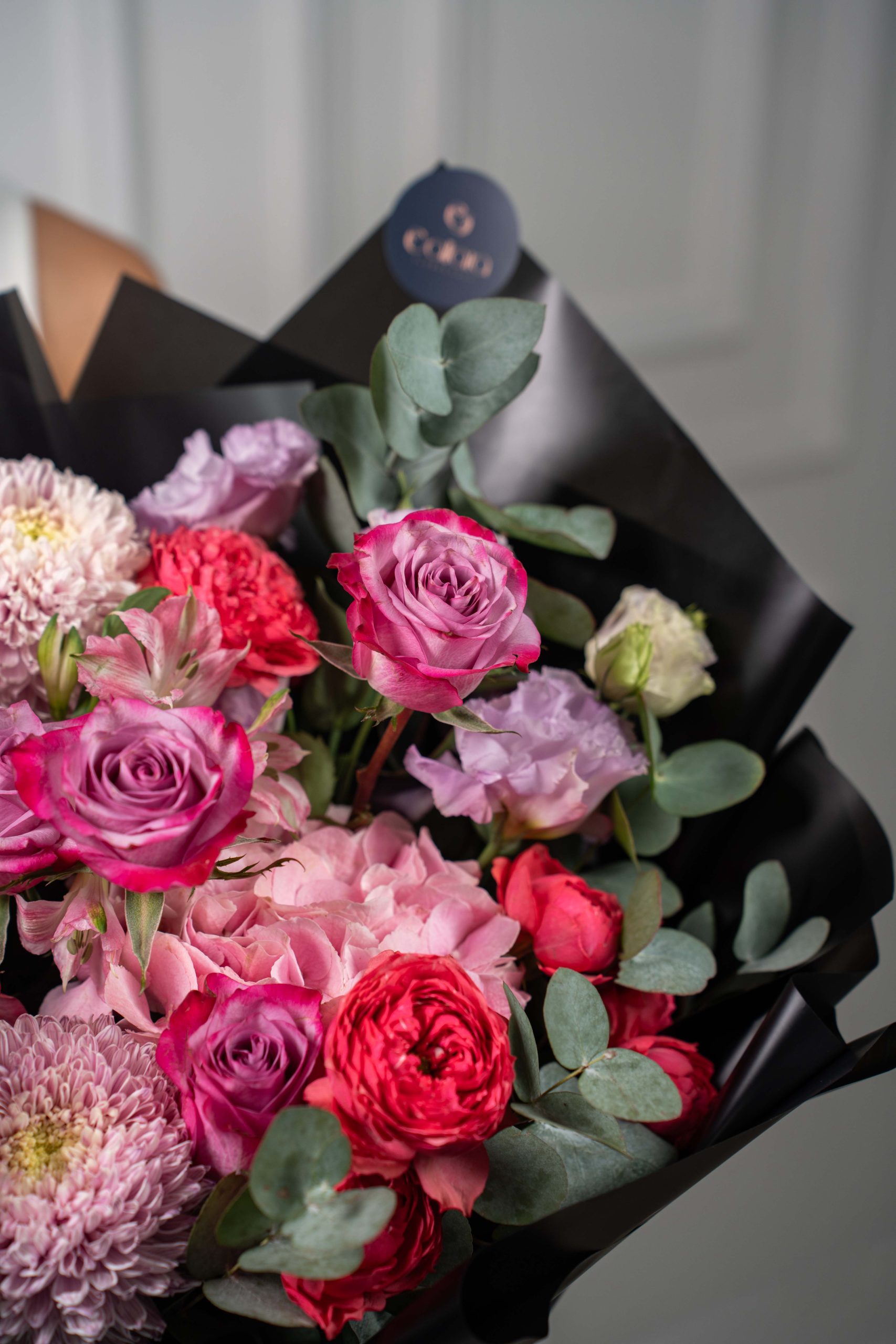 Rosehold is a romantic blend of deep and soft tones, crafted to leave a lasting impression. This elegant bouquet features deep purple roses, raspberry spray roses, pink alstroemeria, and peony-style chrysanthemums, paired with lush hydrangea and eucalyptus for freshness and charm. Wrapped in chic black paper with a satin ribbon, Rosehold is perfect for both grand gestures and thoughtful surprises.