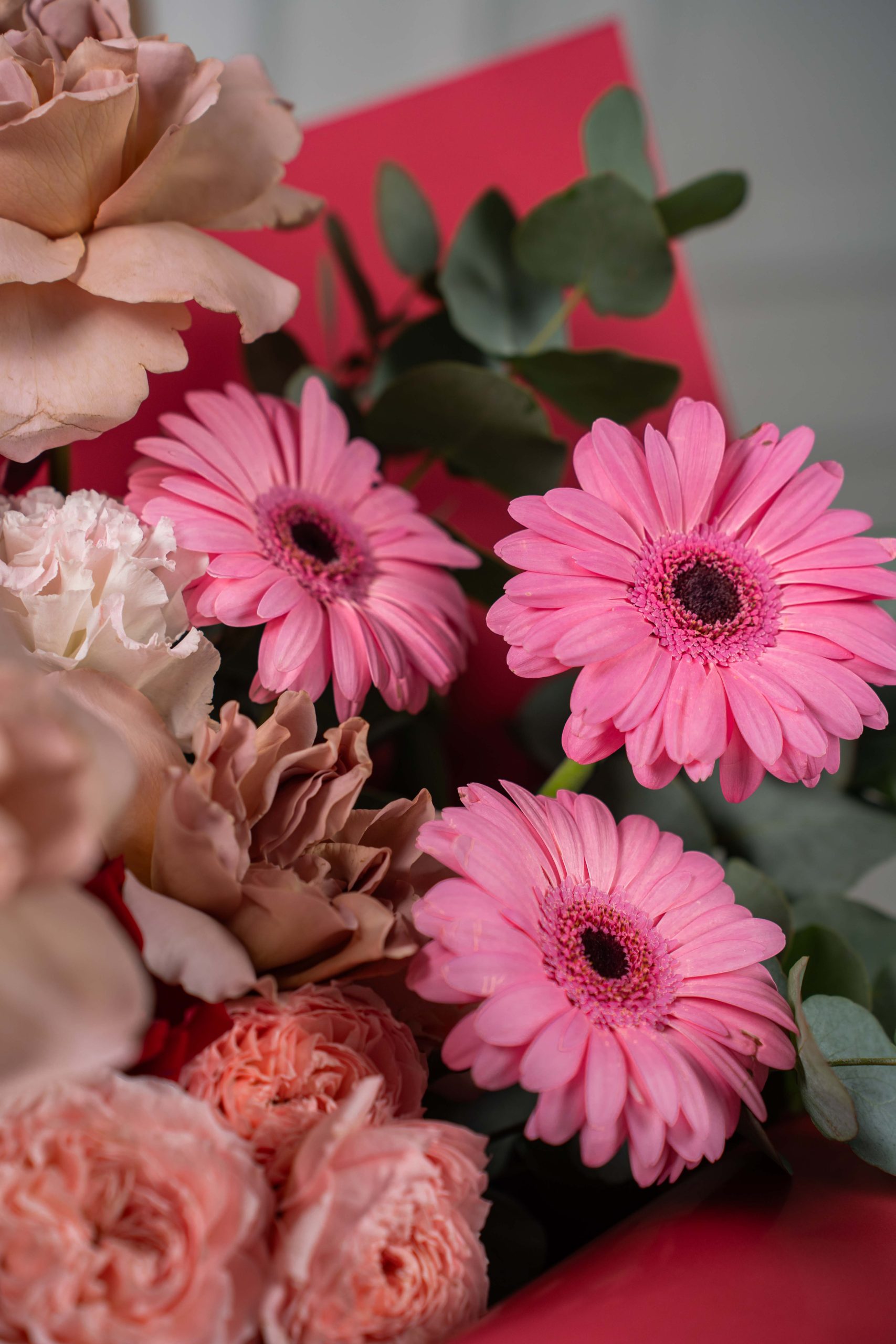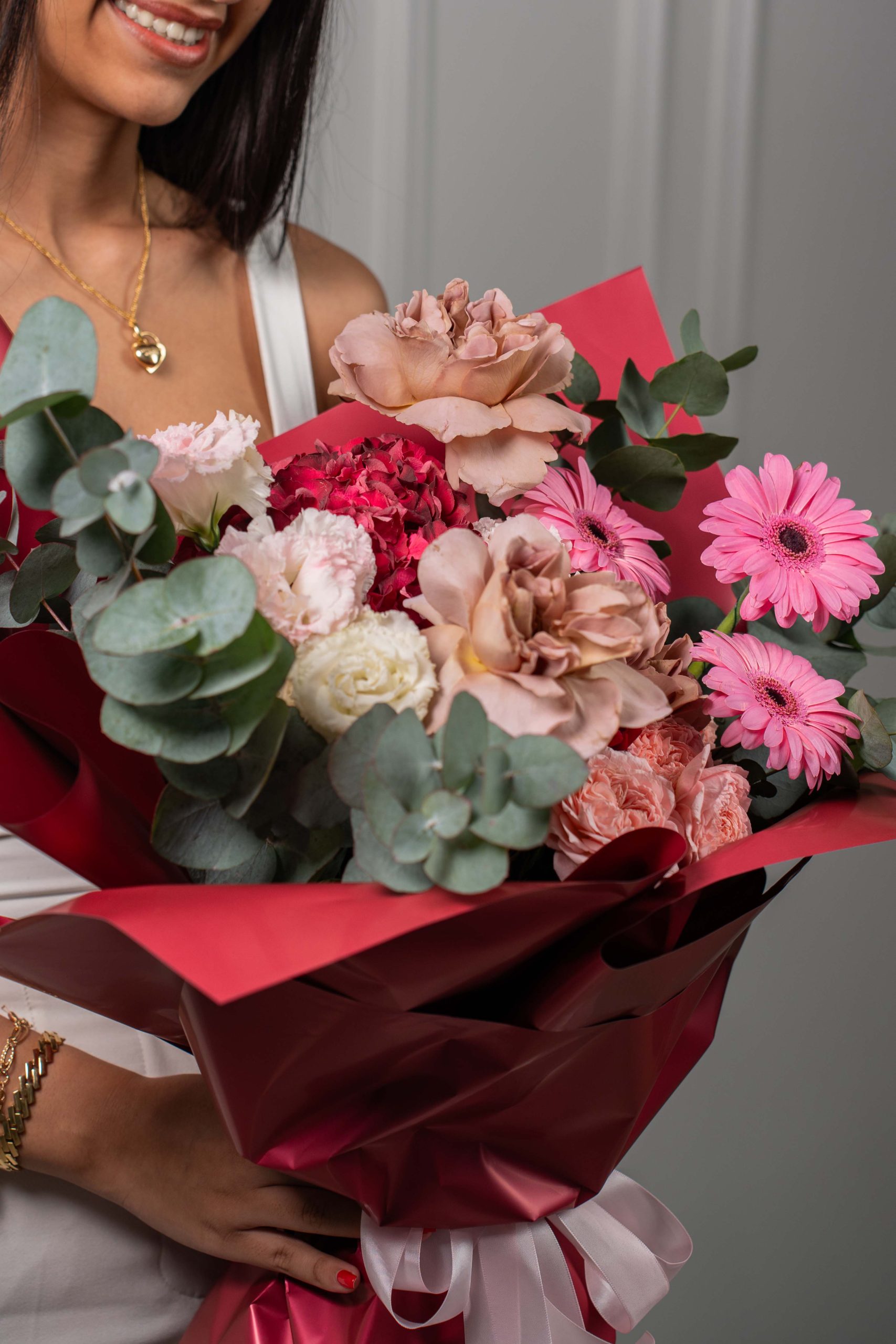 Rosven is a graceful bouquet that blends soft charm with bold accents, perfect for expressing love and appreciation. This arrangement features café latte roses, pink germini, red hydrangea, and peach spray roses, balanced with light pink eustoma and eucalyptus. Wrapped in rich burgundy tones, Rosven makes a stylish and heartfelt gift.