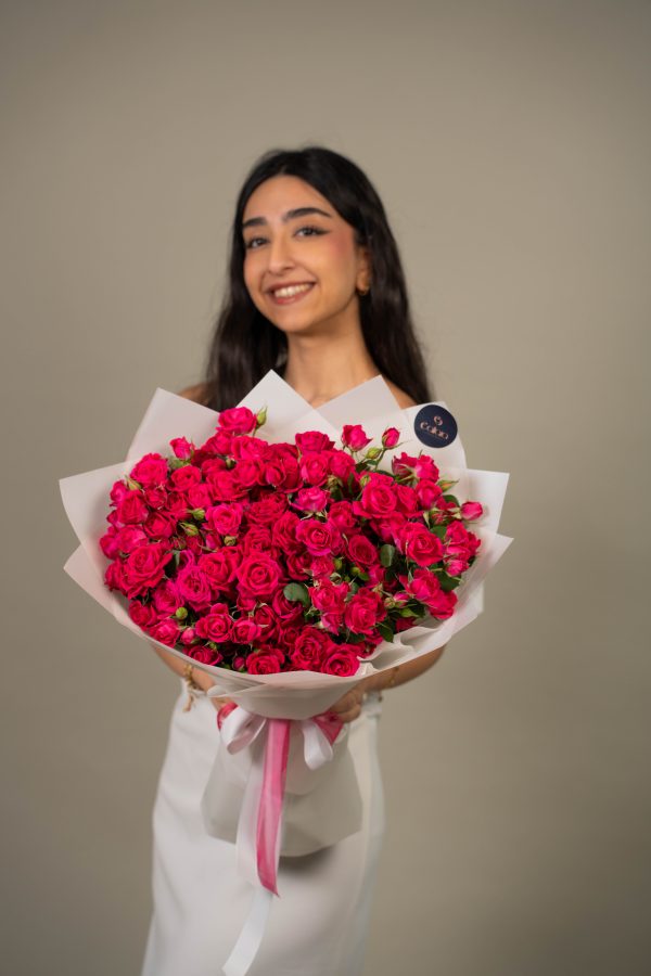 The roses are arranged closely to form a rounded shape that highlights their natural beauty and strong color. Wrapped in white paper and finished with a simple ribbon, Spray Rose Fuchsia has a clean and modern look that keeps the focus on the flowers.
