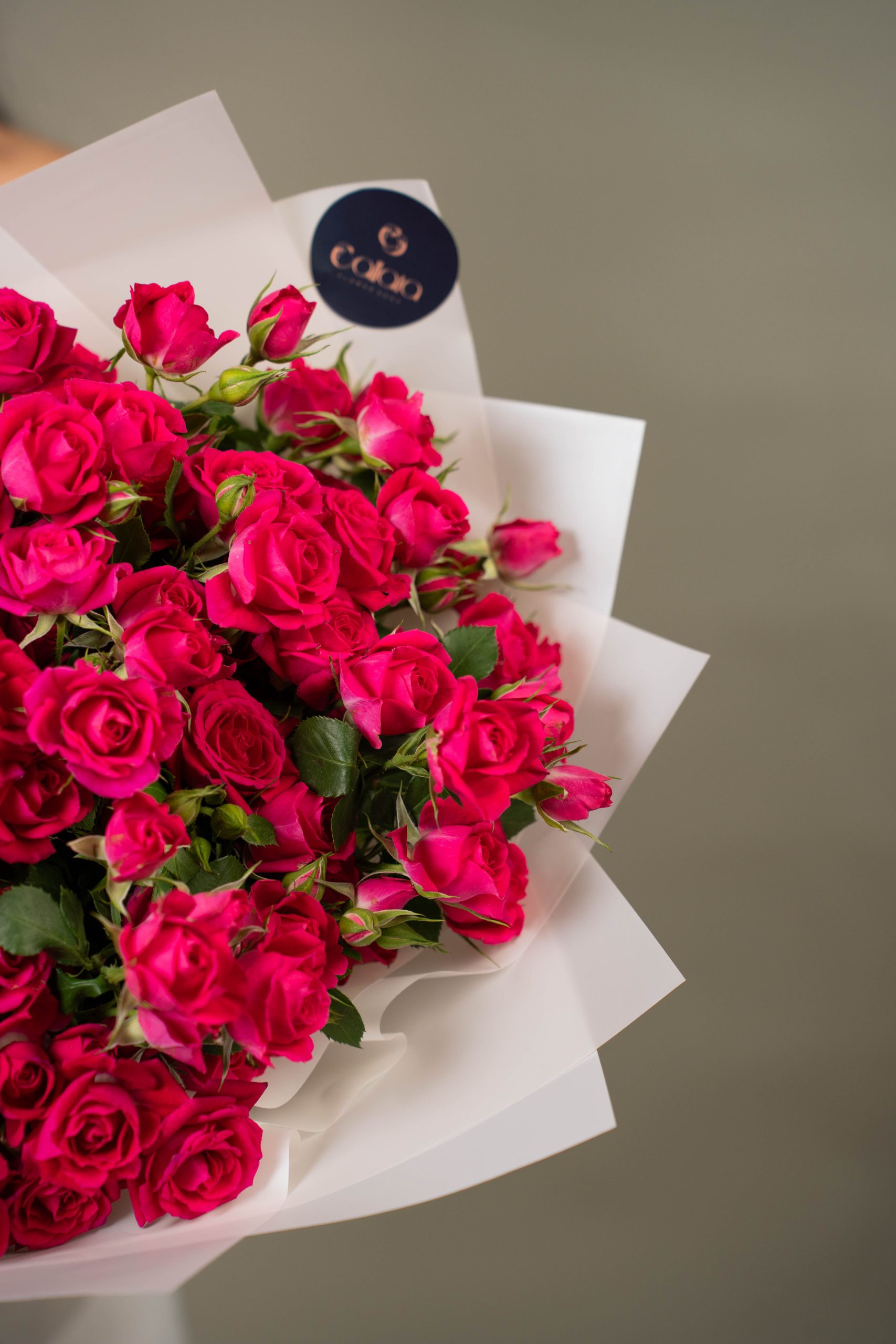 Spray Rose Fuchsia is a bright and eye-catching bouquet of fuchsia spray roses, wrapped in white paper for a bold and joyful floral gift.