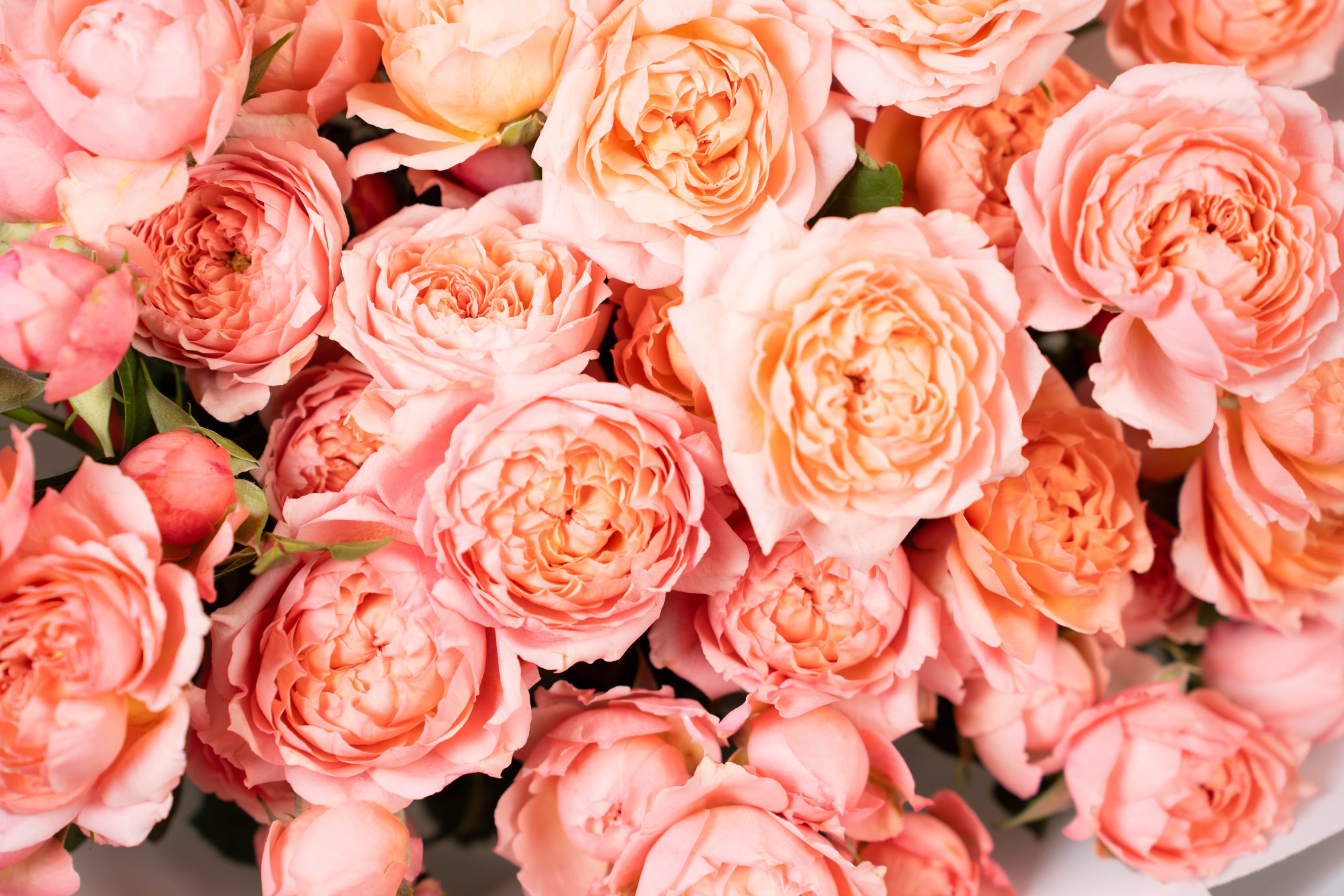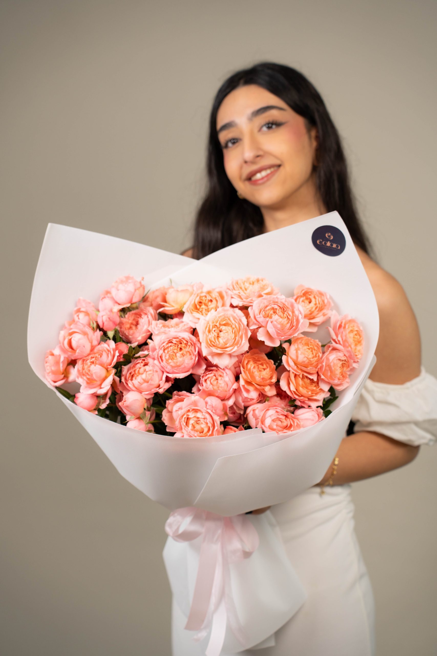 Each spray rose is carefully arranged to form a rounded, abundant shape that highlights the natural beauty of the Julietta variety. The bouquet is wrapped in crisp white paper and finished with a soft blush ribbon, creating a clean and modern presentation that lets the peach hues stand out beautifully.