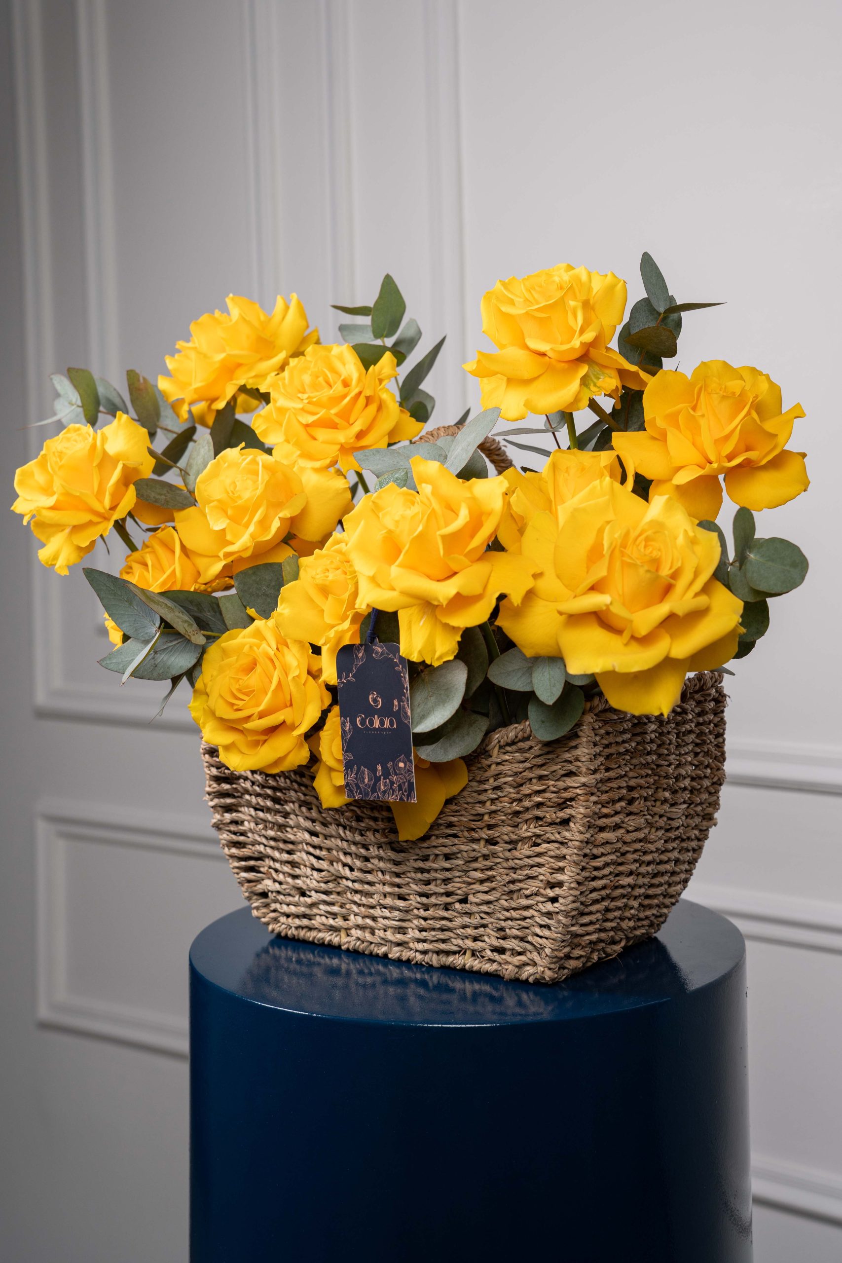This photo beautifully captures a charming basket overflowing with vibrant yellow roses, artfully arranged with lush eucalyptus foliage.