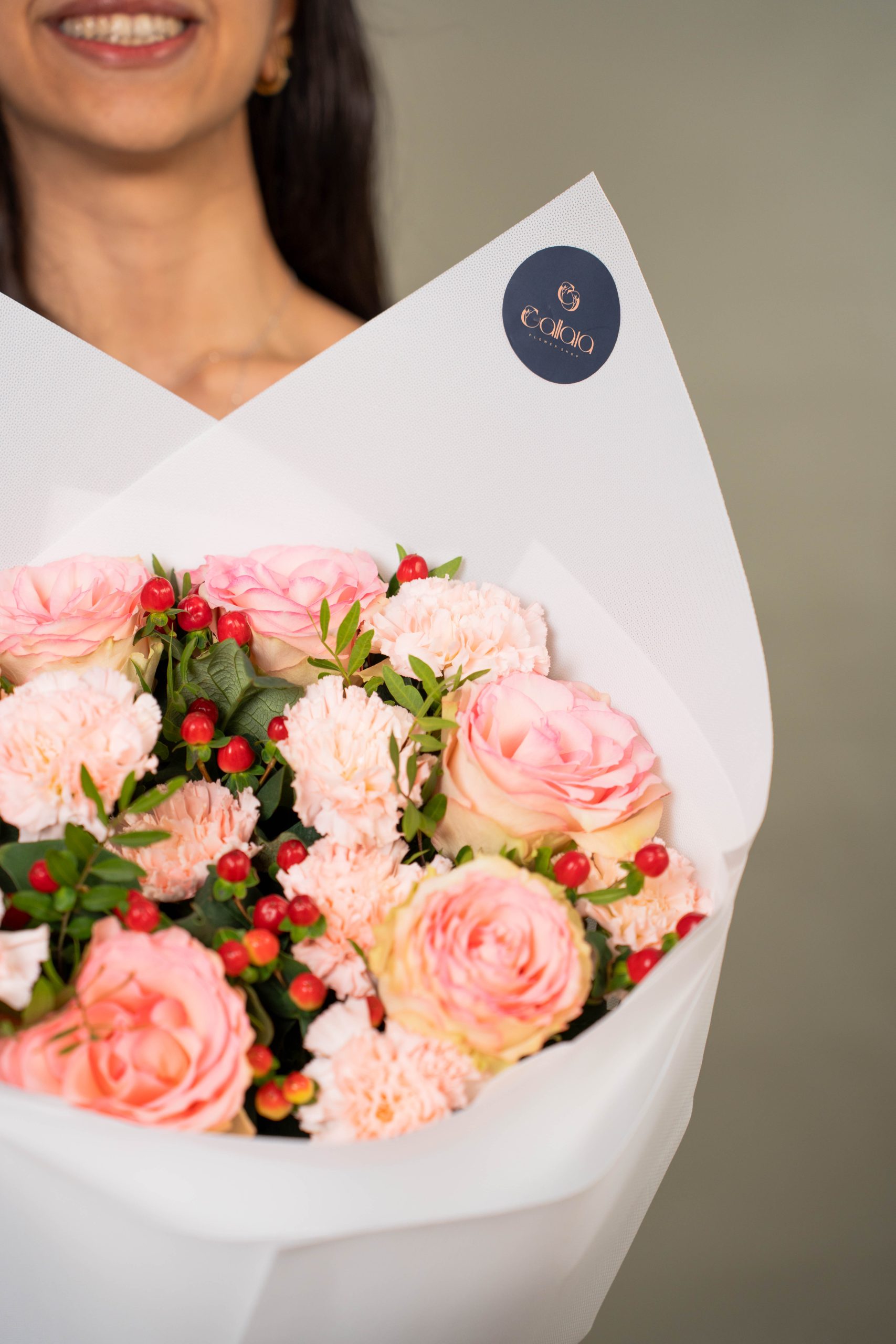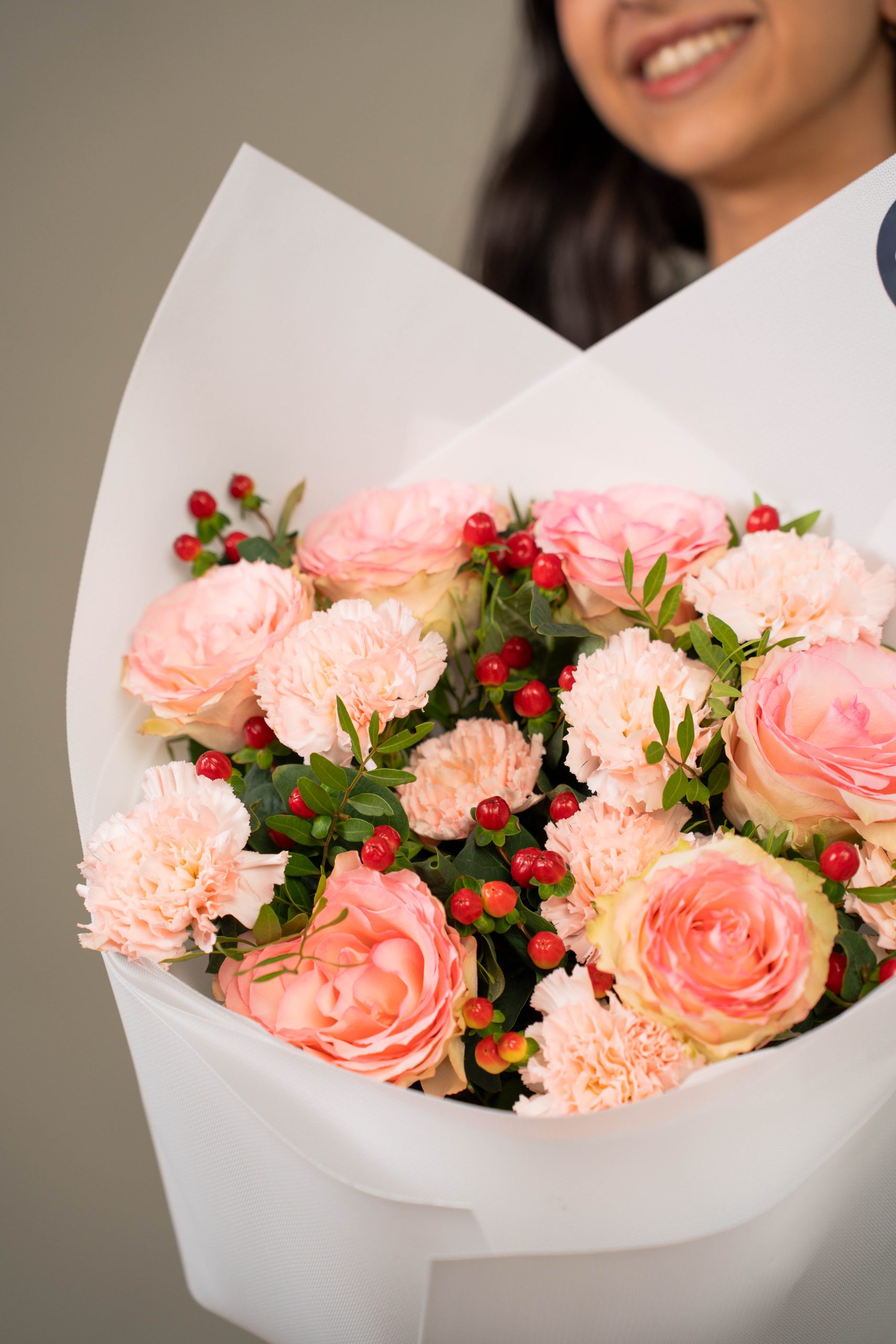 Sweet Clove is a soft and romantic bouquet featuring blush pink roses, delicate carnations, and cheerful red berry accents, beautifully wrapped in crisp white paper for a charming and elegant floral gift.