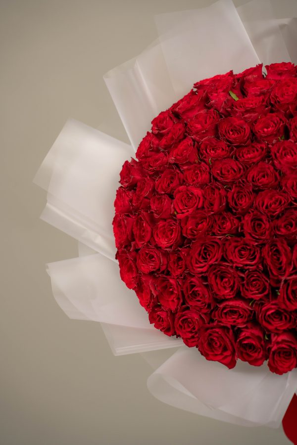 The flowers are arranged in a rounded shape that feels rich and impressive, creating an instant impact. Wrapped in white paper and finished with matching ribbon details, The Hundred Hearts Roses has a clean and classic look that keeps the focus on the beauty of the roses.