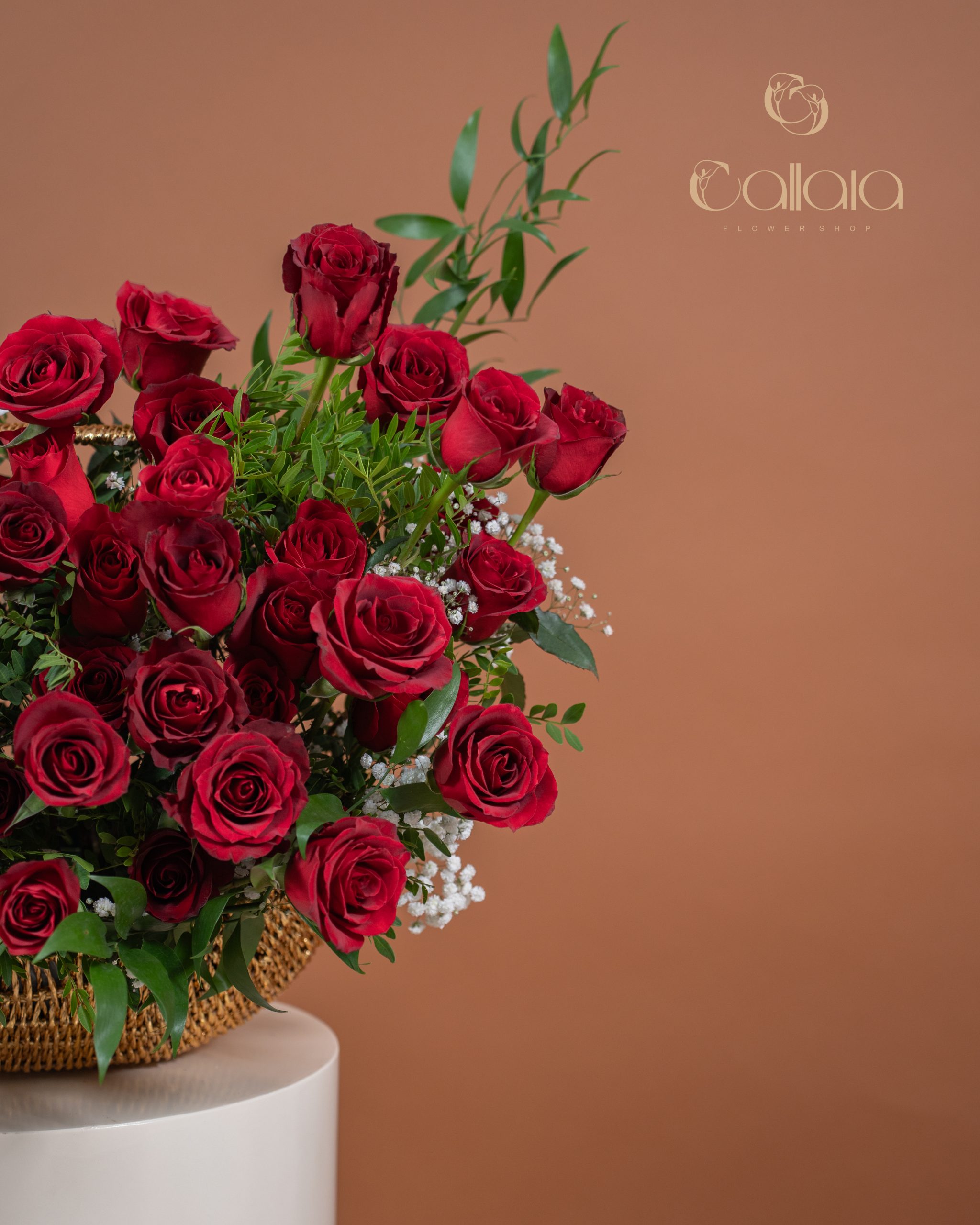 The Red Affair is a timeless and romantic floral arrangement featuring rich red roses, lush greenery, and elegant white Phalaenopsis orchids, designed to express love and sophistication with bold beauty.