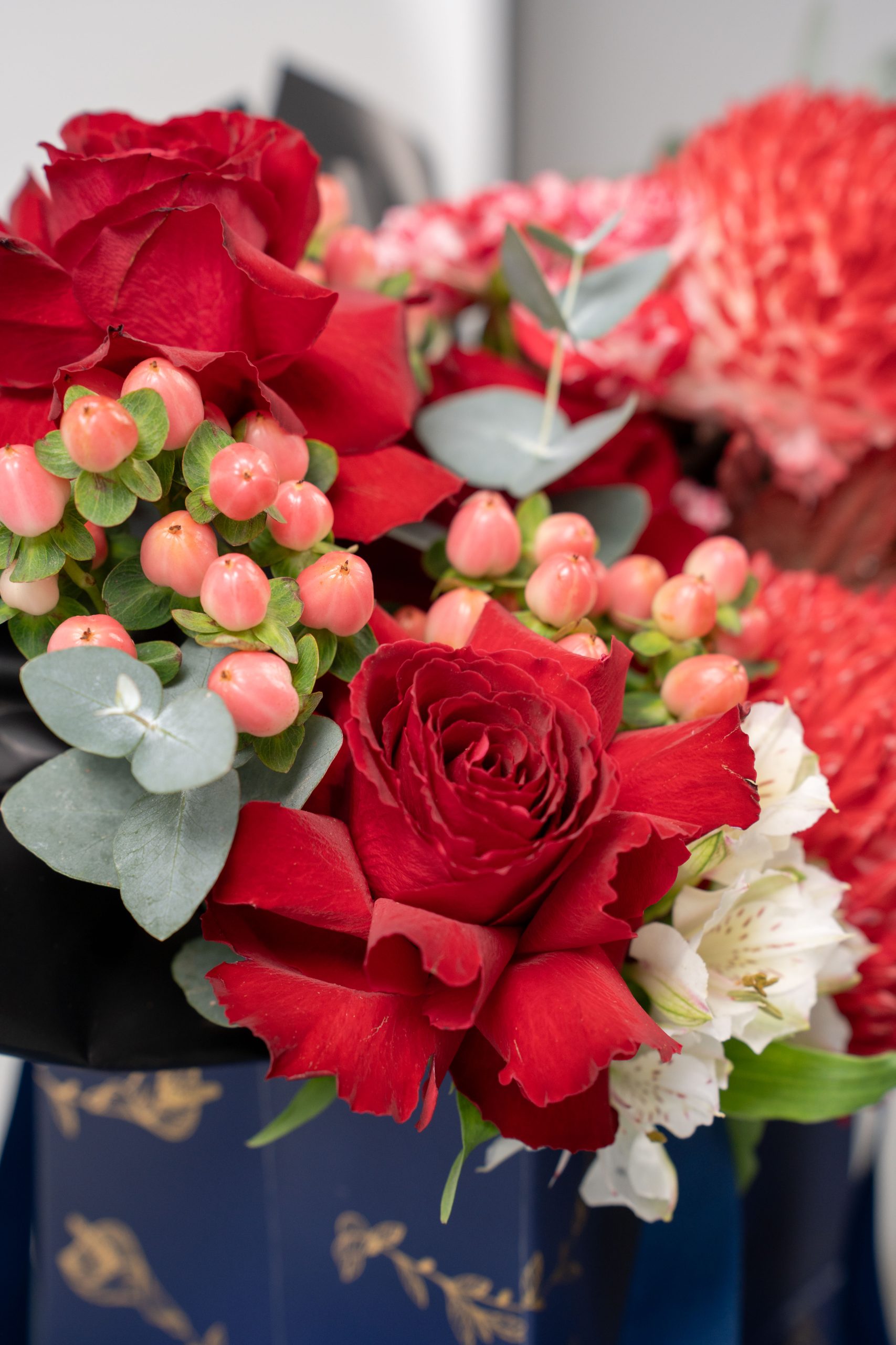 Valiant Bloom is a striking arrangement designed to express confidence, passion, and strength. Showcasing rich red focal flowers, this composition radiates intensity and depth, balanced with soft neutral accents and lush greenery for contrast and dimension.