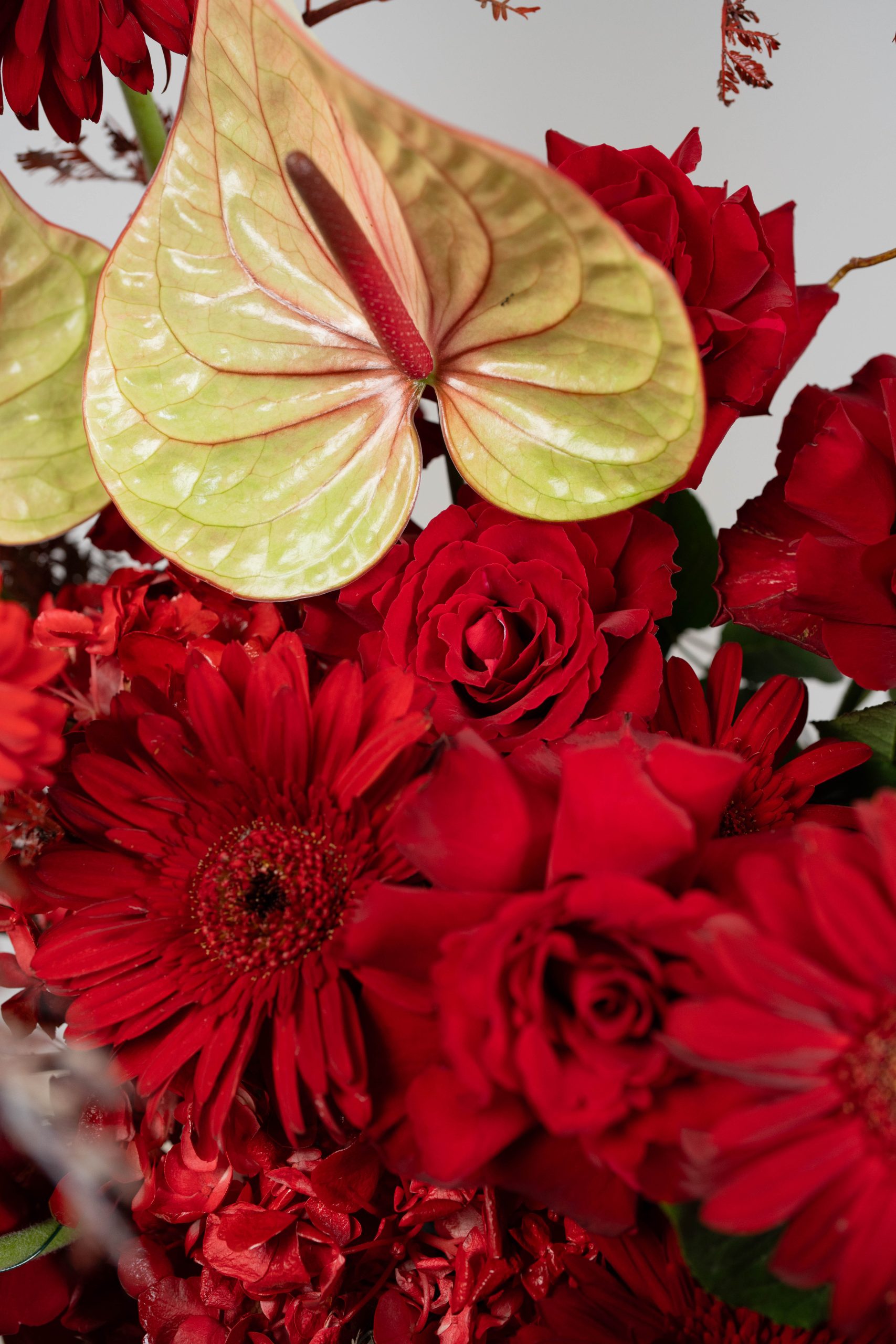 Velvet Passion Box is a powerful expression of love, intensity, and timeless elegance. This captivating arrangement features a lush collection of deep red roses, complemented by bold statement blooms and artistic accents that add texture, depth, and movement. The rich red palette creates an atmosphere of passion and sophistication, making this design truly unforgettable.