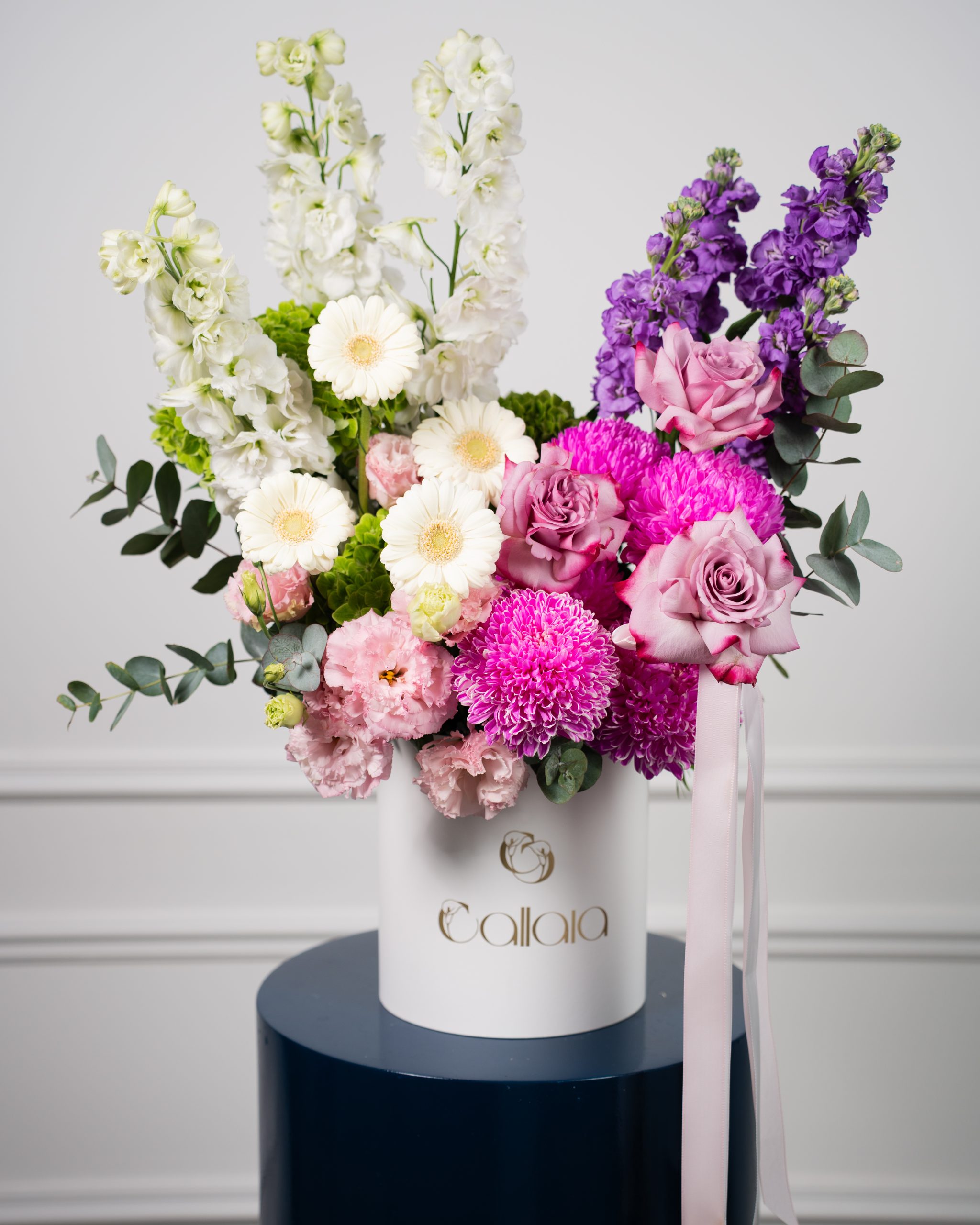 Violia is a breathtaking arrangement featuring deep purple roses, white delphinium, pink chrysanthemums, and lush green hydrangea, all designed in Callaia’s signature box. A perfect blend of elegance and charm, making it ideal for birthdays, anniversaries, or romantic surprises.